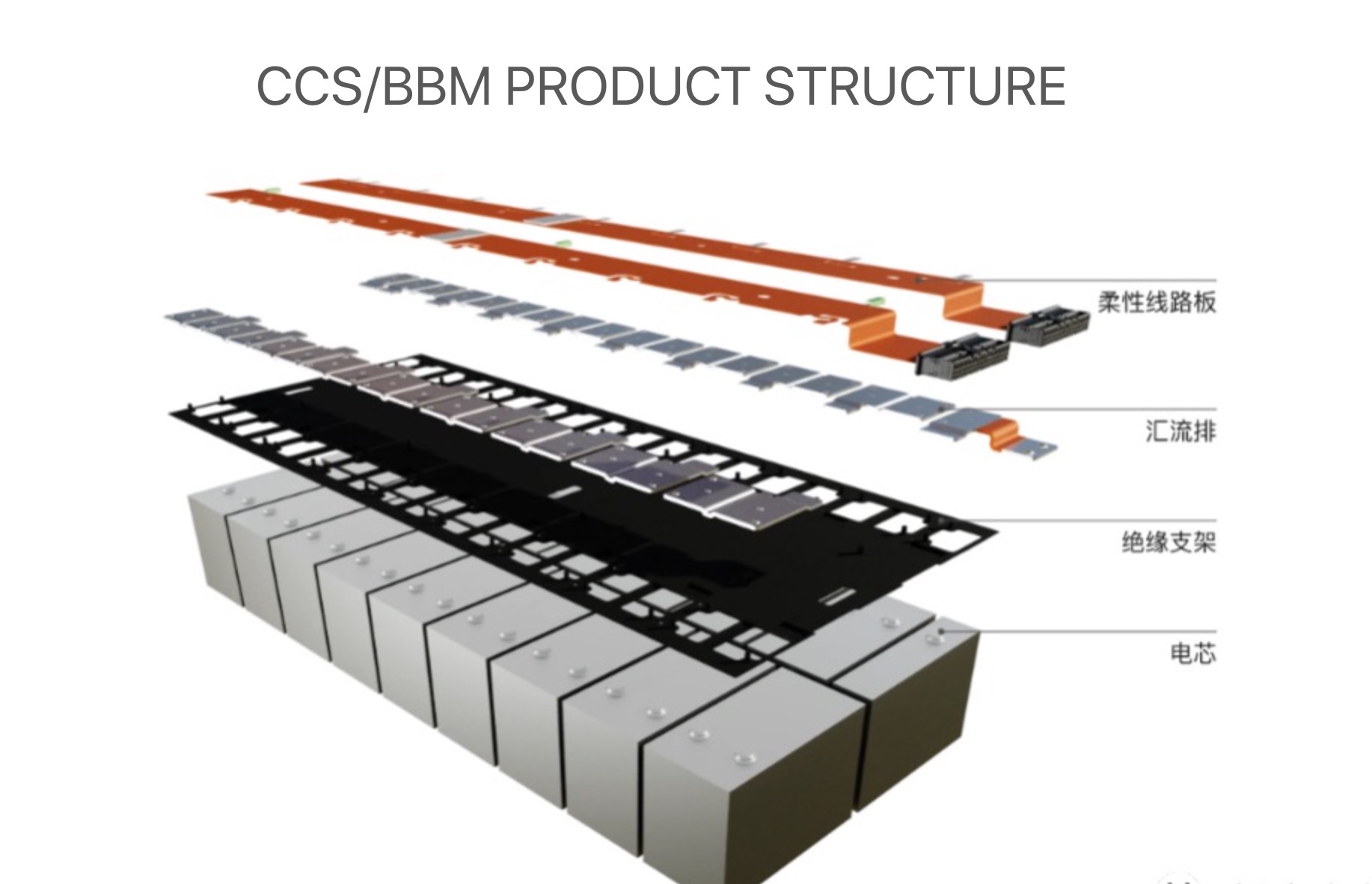 CCS (система контактов ячеек), также известная как интегрированный компонент платы жгута проводов, состоит из компонентов сбора сигналов (жгутов проводов / FPC / FFC и т. д.), пластиковых структурных компонентов, медно-алюминиевых стержней и т. д., соединенных в единое целое с помощью таких процессов, как горячее прессование или клепка, для достижения последовательно-параллельного соединения высоковольтных элементов батареи, а также функций измерения температуры и измерения напряжения аккумуляторных элементов. Он является частью системы BMS и может использоваться в таких областях, как новые энергетические батареи и аккумуляторы энергии.